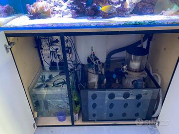 Nr. 2 Lampade Aquaillumination Hydra HD 64, sump elos con skimmer elos NS4000, reattore di calcio elos Rea 120, vasca separata per acqua reintegro, controllo livello tunze 5017, pompe Ehim 1250, pompa movimento tunze e una pompa nuova non installata AI nero 3.