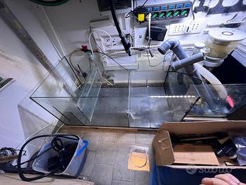 Vendo acquario marino con scarichi come in foto, realizzato in vetro extra chiaro, misura 120x60x60 cm. E un pannello estraibile nel posteriore come in foto