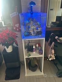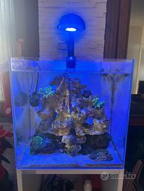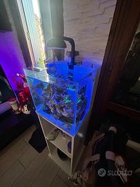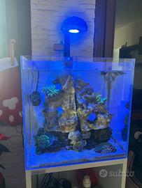 Aq pet reef box 40 x 40 di 64 litri lordi (50 netti) acquistato nel settembre 2024 , completo di riscaldatore, pompa risalita, calza filtrante, skimmer, pompa di movimento voyager nano 1000 l/h, lampada cetus 2 SS, supporto originale aq pet.