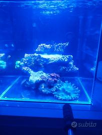 vendo cubo 45x45 in extrachiaro con schiumatoio interno sicce shark 300 3 pompe di movimento di cui 2 nuove filtro esterno a zainetto plafoniera led hydra 32hd dosometrica jebao 4 pesci pagliaccio 2 cromis rocce e alcuni coralli, solo in blocco non ho più tempo di stargli dietro