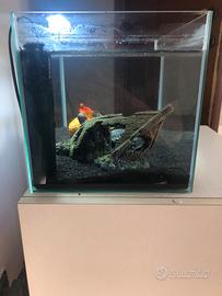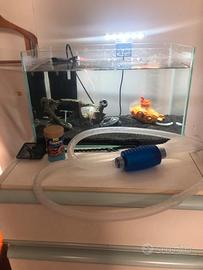 ⚠️VENDO AL MIGLIOR OFFERENTE⚠️ Vendo acquario con pompetta, sifone, retino, luce, cibo per guppy, sabbia nera e blu elettrico e modellini che ci sono dentro.