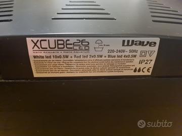 Acquario XCUBE 26 Led colore nero, 31x32x37 cm, 26 litri, completo di accessori (pulitore a calamita per vetri, filtro, pietra decorativa, luce LED). Nuovo 139 euro (allegato screenshot Amazon). Piccolo difetto (tappino a ribalta dov’è l’adesivo “Wave Xcube” guasto) e luce led nuova rispetto a quella originale. Vendo ad appassionati per 50 euro.