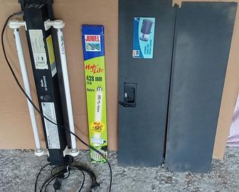Vendiamo acquario Jwuel Lido 120 litri, completo di tutto, pompa + pompa aggiuntiva, come si vede dalla foto il coperchio è leggermente rotto, set completo di filtri + filtri di scorta, lampade nuove, isola da attaccare con le ventose autoregolante in base al livello dell'acqua, cd e istruzioni. Il coperchio con le luci non è mai stato utilizzato in quanto lo usavamo per una tartaruga d'acqua.