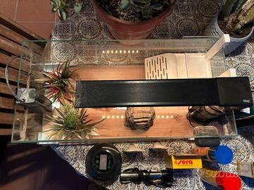 Acquario di ottima fattura, marca Askoll, utilizzato con tartarughe dacqua dolce e pesci tropicali (endler, pulitori, lumache). Da ripulire dalle incrostazioni calcaree ma perfettamente sigillato. Piccola sbeccatura di 2 cm sulla cornice superiore. Si vende in blocco con tutti glinogetti in foto ovvero: 2 filtri funzionanti Sicce, mangiatoia automatica, due termostati, allestimento interno con 4 scenografie pietra/piante, batteri liquidi per acqua SERA, condizionatore per acqua SERA, test nitrati, vitamina per pesci torpicali di acqua dolce, 2 integratori per piante acquatiche (solo questi valgono 40€), 2 sifoni per i cambi dellacqua periodica, magnete togli incrostazioni. Per ulteriori foto chiedete pure. Solo scambio a mano