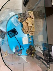 Questo set include un acquario panoramico da circa 100 litri, caratterizzato da un vetro frontale curvo a 180° che offre una visione senza interruzioni. La vasca poggia su un mobile di design coordinato con un elegante profilo a "S" bicolore (nero e grigio).All'interno e intorno alla vasca sono visibili diversi componenti e accessori:Arredi: Rocce decorative realistiche e una pagoda in miniatura.Attrezzatura tecnica: Un filtro a zainetto agganciato al bordo, un riscaldatore a immersione con termometro giallo e un'asta per l'illuminazione LED.Accessori per la cura: Un retino nero, un contenitore in plastica trasparente e sacchi di sabbia decorativa a marchio AquaSan.