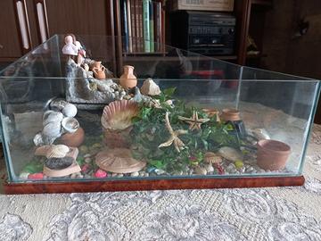 Tartarughiera ben rifinita in Vetro completa di Isola, decorazioni varie vegetazione sassi, pompa acqua.