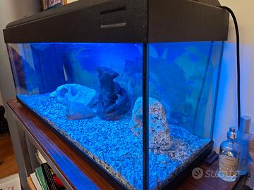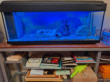 Acquario per pesci, usato solo 5 anni. Dimensioni: lunghezza cm 100, larghezza 30 cm altezza 47 cm. La capacità è di circa 80/85 litri. L'acquario è dotato di poster per lo sfondo, brecciolino e oggetti di arredo per il fondale, retino, filtri in ceramica e filtri in tessuto, illuminazione funzionante a neon e pompa per il ricircolo dell'acqua. Possibilità di vendere anche il mobiletto di sostegno in ferro legno e vetro per 70 euro.
