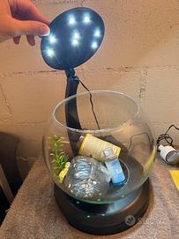 Acquario per pesci usato ma tenuto molto bene, la palla di vetro è perfetta (nella foto vi è solo delle polvere), ideale per piccoli pesci vista la capacità di 6,8L, presenta una pompa con sistema di filtraggio e cascata, illuminazione a LED. Per informazioni ulteriori contattatemi.