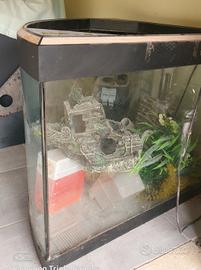 acquario ad angolo con 2 fori sul fondo Overflow bello grande purtroppo senza mobile, ma con molti oggetti all'interno per abbellire l'acquario tipo nave affondata piantine acquatiche ecc ecc. dimensioni altezza 60 cm larghezza 96 cm e dalla punta al cerchio 68 cm p.s. ce anche il motore credo sia riciclo acqua, (si vede all'interno nelle foto) funzionante solo quello costa sulle 50 euro.