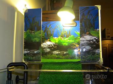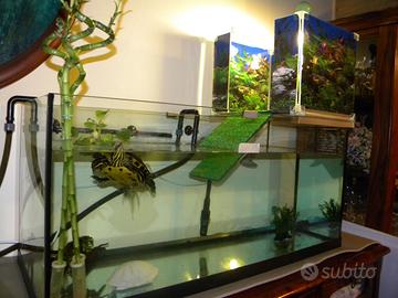 Vendo acquario scoperto di cm 100 lunghezza x 40 profondità x 45 altezza. Sono compresi i seguenti accessori: - Riscaldatore - Piattaforma su misura in plexiglas per basking tartaruga - Due portalamapade con lampade - Aspiratore di detriti marca JBL - Asta e spugnone per pulizia vetri - Raschietto e e spray marca JBL per pulizia vetri - Strisce per analisi dell'acqua. Solo ritiro a mano su Foggia, NON SPEDISCO O CONSEGNO. piante non incluse. 150 euro