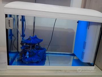 acquario contenente 60 l con profondità 32 cm, altezza 40 cm e lunghezza 60 cm. comprensivo di casetta tibetana, spugna pulisci vetri, spazzola magnetica per pulizia, riscaldatore,campana di aspirazione pet, erogatore di bollicine