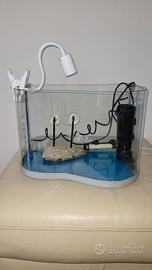 vendo acquario per tartarughe acqua usato pochissimo misure altezza 29 cm, larghezza 42 cm, profondità 28 cm con riscaldamento, luce,piattaforma con ventose e filtro
