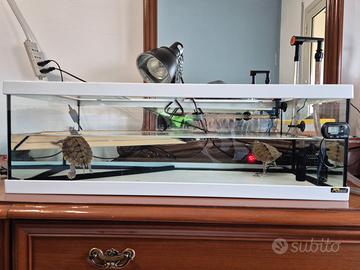 Vendo acquario tartarughiera completa di filtro riscaldatore lampada ai vapori di mercurio pompa per cambio acqua e altri accessori che non sono presenti in foto, tutto compreso di tartarughe 150 euro poco trattabile.