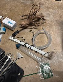 Vendo acquario per inutilizzo. Presenti le seguenti cose: -Riscaldatore 50watt -Colla da acquario per fissare rocce -filtro a zainetto -anelli di ceramica per filtro -spugna per filtro -lampada led -pulitore magnetico per vetro acquario -sifone per pulizia acquario -retino -strumenti per taglio e sistemazione piante e varie -tronco di legno Per qualsiasi info sono a disposizione. Preferisco ritiro a mano. Prezzo leggermente trattabile