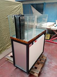 Acquario comprensivo di mobile, zona filtro creata a parte in vetro, così da avere tutto il volume libero. No coperchio, no impianto di illuminazione.