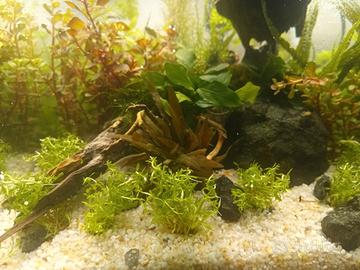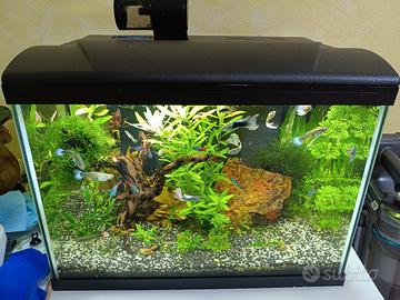 acquario perfetto senza segni avviato da 2 anni completo di luce led filtro interno riscaldatore mangiatoia automatica con fondo fertile a completamento 2 roccie radice e piante vere pesci neon, Guppy , corridoras, alcune lumache