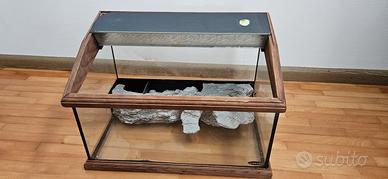 Utilizzabile sia come acquario sia come acquario per tartarughe. in buonissimo stato, la parte superiore permette di inserire una lampada all'interno del vetro. la parte delle rocce non è plastica ma pietra.