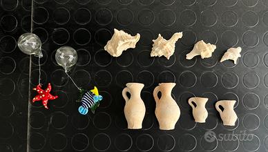 Decorazioni varie: conchiglie, anforette e ornamenti in vetro (pesciolino, stella marina)