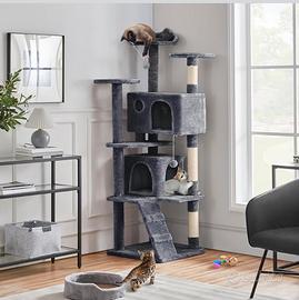 Albero Tiragraffi per Gatti 178 cm con 3 Posatoi 2 Palle 2 Condomini 3 Tiragraffi a Corda di Sisal Gioco Giocattolo Grigio Scuro.