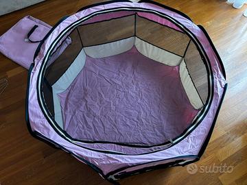 Vendo per non utilizzo recinto box AQPET per Animali Cani e Gatti Cuccioli. Pieghevole in Tessuto Impermeabile (Rosa) Usato per addestrare una cagnolina, ha qualche segno di usura ma ancora in ottime condizioni. Completo di sacca da trasporto e picchetti per eventuale blocco in un giardino. Misure 115L x 115l x 16H cm, 8 Pannelli , 115cm x 61cm La parte sopra si chiude con la rete.