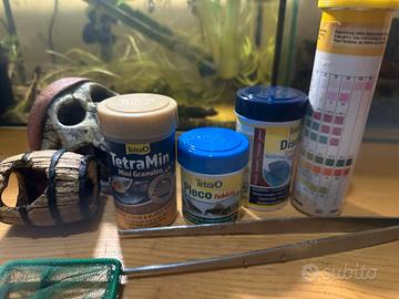 cibo per pesci , attrezzi per la manutenzione dell' acquario, test acqua, riscaldatore ,tre filtri , luci ,plafoniera per il cambio d'acqua,allestimento teschio e barile rotto , sala da parto FDT , ossigenatore