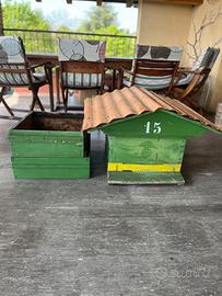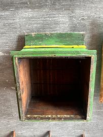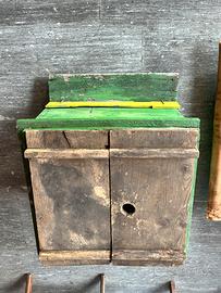 arnia in legno per api composta da: * corpo arnia * tetto in lamiera ondulata * 2 estensori / moduli aggiuntivi visibili in foto Oggetto usato, con chiari segni del tempo e dell’utilizzo, come da immagini. Struttura in legno dal fascino rustico/vintage, interessante sia per: * utilizzo decorativo * allestimenti rustici * collezionismo * eventuale recupero/restauro Presenta usura, scoloriture, ossidazione del tetto e imperfezioni coerenti con l’età dell’oggetto. Numerazione frontale visibile. Venduto esattamente come in foto.