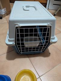 comprende: lettiera un po' rovinata trasportino in ottime condizioni 2 ciotole cestino in vimini da utilizzare come cuccia
