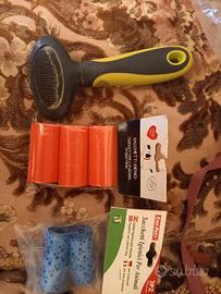 vari oggetti usati pochissimo per la tolettatura e l'igiene del cane tra cui sacchetti per la cacca, spazzole varie e una pettorina taglia piccola per cane o gatto. 10 euro