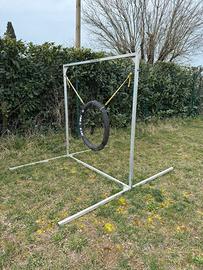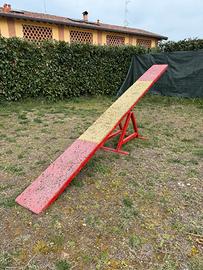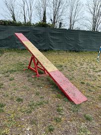 Bascula Agility dog , misure lunghezza 360, larghezza 30 cm, altezza massima 120. Ostacolo ruota , misure 160 per 160, circonferenza interna della ruota 55 cm.