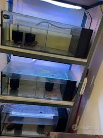 Vendo scaffale con 3 acquari artigianali usati per riproduzioni di lorocaridi. 2 vasche misurano 90x40x30 e la terza 90x45x40.