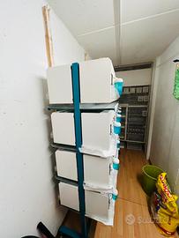 La batteriamisura L 2,20 x P 0,80 H 1,80, completamente tutto ferro verniciato a polvere con ricambi griglie fondo e frontali. Sono 20 gabbie per lato totali 40 gabbie, sistema carta a rulli, carrello in ferro a ruote nn smontabile, unico carrello!!! Regalo i rotoli di carta valore 100€ no affaristi. MIS. Gabbia singola 35x30x 20 profondità