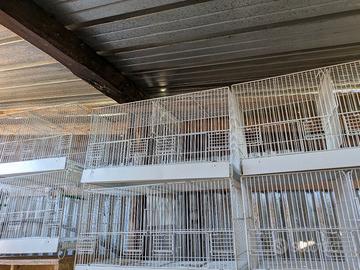 disponibile batteria di 6 gabbie 64cm *28cm*34cm di altezza. Ogni gabbia ha un pratico divisorio così da avere 12 spazzi da 32cm di larghezza. qualche segno del tempo sulle griglie e sulla laccatura. Valuto scambi