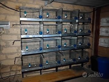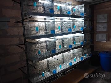 vendo bellissima batteria zingata come nuova un poco sporca da pulire.. 16 Gabbie da 58cm sistema carta, luci LED con interruttore on off, supporto gabbie con ruote e freni nelle ruote, manciatoie,beverini, posatoi, doppia griglia con tutti i fondi, per canarini pappagalli di piccola taglia o altro... completa in tutto non manca nulla solo x persone serie e interessate contattare al numero 3274535727 prezzo non trattabile