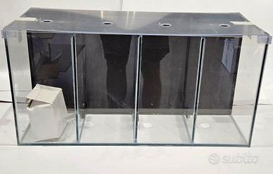 Acquario per pesci combattenti diviso in 3 sezioni completo di sfondo nero, plexiglass di copertura, griglie di aspirazione, pompa e tubo di mandata dell'acqua.