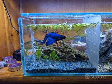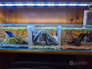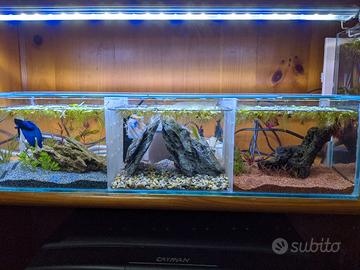 si vende splendido Bettiera x 3 splendido Acquario Artigianale fatto di VETRO TEMPERATO DA 6mm, PRIVO DI GRAFFI DI QUALSIASI TIPO! il vetro non è commerciale, ma interamente fatto di vetro Temperato, difficile da graffiare, da crepare, e tiene ancora meglio la temperatura all'interno . 60×15×15 CON TAPPO IN VETRO TEMPERATO Lavoro eseguito da un vetraio silicone per acquari da 300l migliore qualità di quelli commerciali specifico per betta BETTA ESPOSTI NON IN VENDITA prezzo leggermente trattabile contattatemi per mail o whatsapp