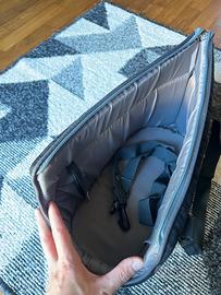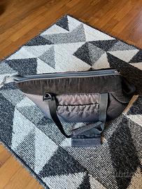 Vendo borsa per cani/gatti di piccola taglia. Colore grigio con dettaglio in velluto esterno, tasche laterali, accessorio per tracolla, gancio interno per collare, fondo imbottito.