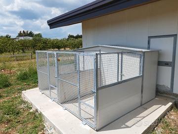Le dimensioni possono variare da 4x4 m (4x2 m per ogni box) a 3x4 m (3x2 m per ogni box) e sono l'ideale per far stazionare 2 cani per postazione.