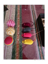 4 Topolini colorati: Topi in finta pelliccia/feltro con coda, pronti per essere lanciati, inseguiti e probabilmente nascosti sotto il divano per sempre (colori: rosso, nero, fucsia, giallo).