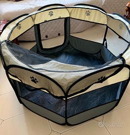 Usato per un mese ma in buone condizioni. Tutto pieghevole in plastica e retina con il tetto staccabile con la cerniere. Facile da pulire e trasportare. Misura grande!