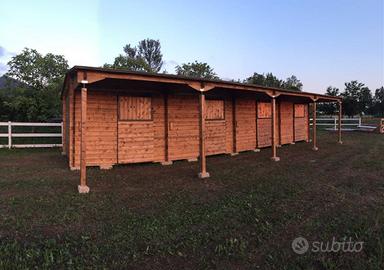 Realizziamo box e scuderie su misura con sistema di montaggio in blockhaus o a telaio lamellare.