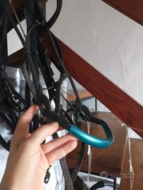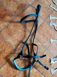 Vendo briglia/trensa bitless (senza imboccatura), adatta per monta naturale e cavalli sensibili. Taglia Full (Warmblood), realizzata in cuoio/pelle colore nero. In vendita solo la briglia, senza redini. Possibilità di ritiro a mano o spedizione.