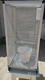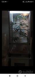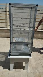 Cedo camaleontario in rete 50X50X100 con mpbiletto bianco,mangiatoia, scolatoio artigianale in alluminio con vassoio, nebulizzatore professionale lunga gittata per riprodurre pioggia artificiale, portalampada professionale con pinza, portaneon con riflettore professionale. Praticamente c'è tutto l'occorrente per permettere al vostro camaleonte di avere un'ambiente adatto alla sua stabulazione. Cedo il tutto ad un ottimo prezzo per immediato realizzo in quanto se acquistati singolarmente comporterebbero una spesa davvero esosa.