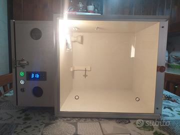 Camera Calda Digitale Nuova, accessoriata di tutto, in legno di pioppo spess. 10 mm, protetta internamente ed esternamente con smalto grigio chiaro neutro all'acqua apposito per legno, con anta scorrevole spess. mm 4 , per pappagalli e pulli per tutte le specie di volatili.