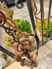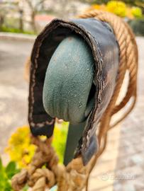 La capezza è arricchita da inserti in cuoio antico, cuciti a mano direttamente sulla corda, che garantiscono robustezza, durata e un’eleganza rustica inconfondibile. Ogni cucitura evidenzia la cura artigianale e la qualità dei materiali utilizzati.