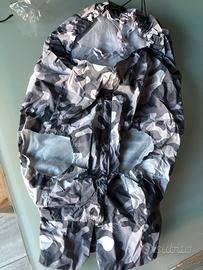 Nuovo con cartellino mai indossato. Sacchetto custodia, impermeabile e antivento, interno in mesh, banda catarifrangente sulla schiena, foro per guinzaglio, elastici regolabili per zampe posteriori, colore minetico grigio