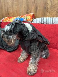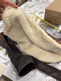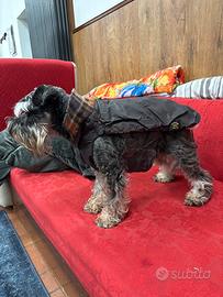 Cappottino impermeabile in nylon marrone scuro con imbottitura in pelo di lana merinos e avrilico, sfoderabile, copre anche l’addome. Per cani di taglia piccola di peso 6-10 kg lunghezza tronco 37 cm