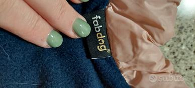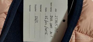 Cappottino imbottito per cani e gatti di taglia media. Presenta un design a blocchi di colore con pannelli rosa, blu navy e bianchi.