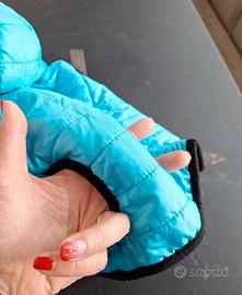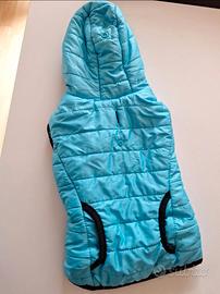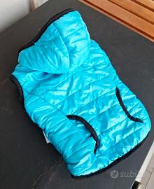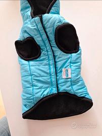 Bellissimo cappottino imbottito per cani di piccola/media taglia, color celeste brillante con profili neri 🐾. Interno in morbido pile nero per garantire il massimo calore durante le passeggiate invernali ❄️. Dotato di pratico cappuccio e foro sulla schiena per il passaggio del guinzaglio/pettorina 🦴. Caratteristiche principali: Taglia: M, adatto però per cani di piccola taglia📏 Materiale: 100% Poliestere 🧶 Condizioni: Ottime, come da foto ✨ Misure: Lunghezza circa 30 cm (controllare foto con righello) 📐