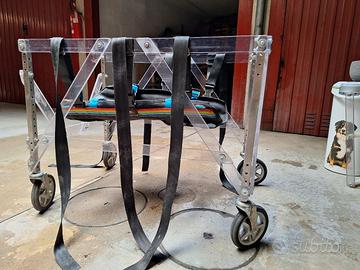 carrellino in plexiglass con cinghie, adatto per sostenere il cane anziano con poca mobilità o per recupero da intervento .