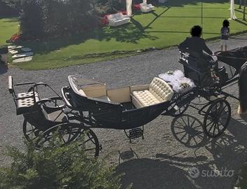 Carrozza per matrimoni Dispone di: - targa e revisione - persone trasportabili compreso condutture 8 posti - lunghezza 5.30m - larghezza 1.74m - pneumatici a gomma piena - larghezza cerchioni anteriori 100cm - larghezza cerchioni posteriori 130cm - sospensioni a balestra - impianto frenante idraulico a disco - struttura in legno e ferro colore blu scuro - scalette laterali per salita passeggeri - tappezzeria in pelle colore bianco - copertura passeggeri scapottabile - fanali, cestino per addobbi - catadiottri posteriori 2 colore rosso - freno a mano di stazionamento La carrozza é dotata di un attacco timone centrale per attacco pariglia ( 2 cavalli )